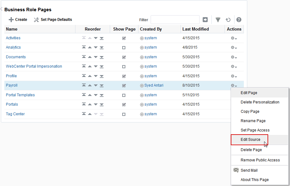 ビジネス・ロール・ページのEdit Page権限がある場合は、コンポーザでページを開かずにページのソースを編集できます。