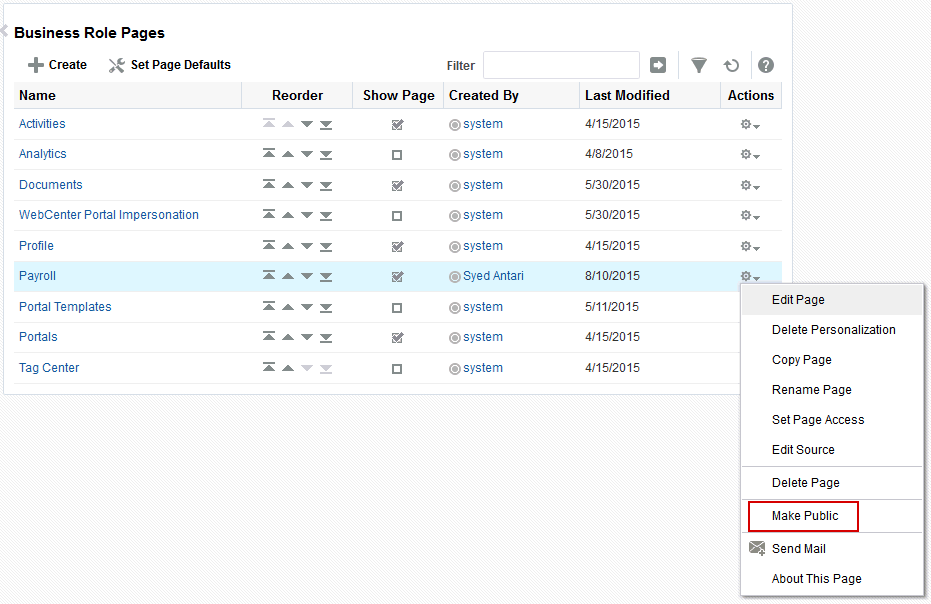 pages.xmlファイルのセキュリティを必要に応じて変更します。つまり、各ビジネス・ロール・ページを非表示または表示にマークします。<!-- Business Role Pages --> <pageDef id="Page_2eb852ac_10f5902cb2f__7ff7" contentMRef="/oracle/webcenter/page/scopedMD/ s8bba98ff_4cbb_40b8_beee_296c916a23ed/businessRolePages/ ActivityStreamMainView.jspx" shared="true" hidden="true"/>...<pageDef id="Page_2eb852ac_10f5902cb2f__7ff7" contentMRef="/oracle/webcenter/page/scopedMD/ s8bba98ff_4cbb_40b8_beee_296c916a23ed/businessRolePages/ ASpaceTemplatesMainView.jspx" shared="true" hidden="false"/>...<pageDef id="Page_2eb852ac_10f5902cb2f__7ff7" contentMRef="/oracle/webcenter/page/scopedMD/ s8bba98ff_4cbb_40b8_beee_296c916a23ed/businessRolePages/ MyProfileMainView.jspx" shared="true" hidden="true"/>...-