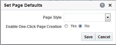 WebCenter Portalシステム管理者は、ページ作成のデフォルトを設定し、ビジネス・ロール・ページの作成に必要なステップの数を減らすことができます。つまり、「ページの作成」ダイアログを開いたときにデフォルトで選択されているページ・スタイルを指定できます。「ページの作成」ダイアログをバイパスすることも選択できます。こうすると、デフォルトのページ・スタイルが強制的に選択されます。