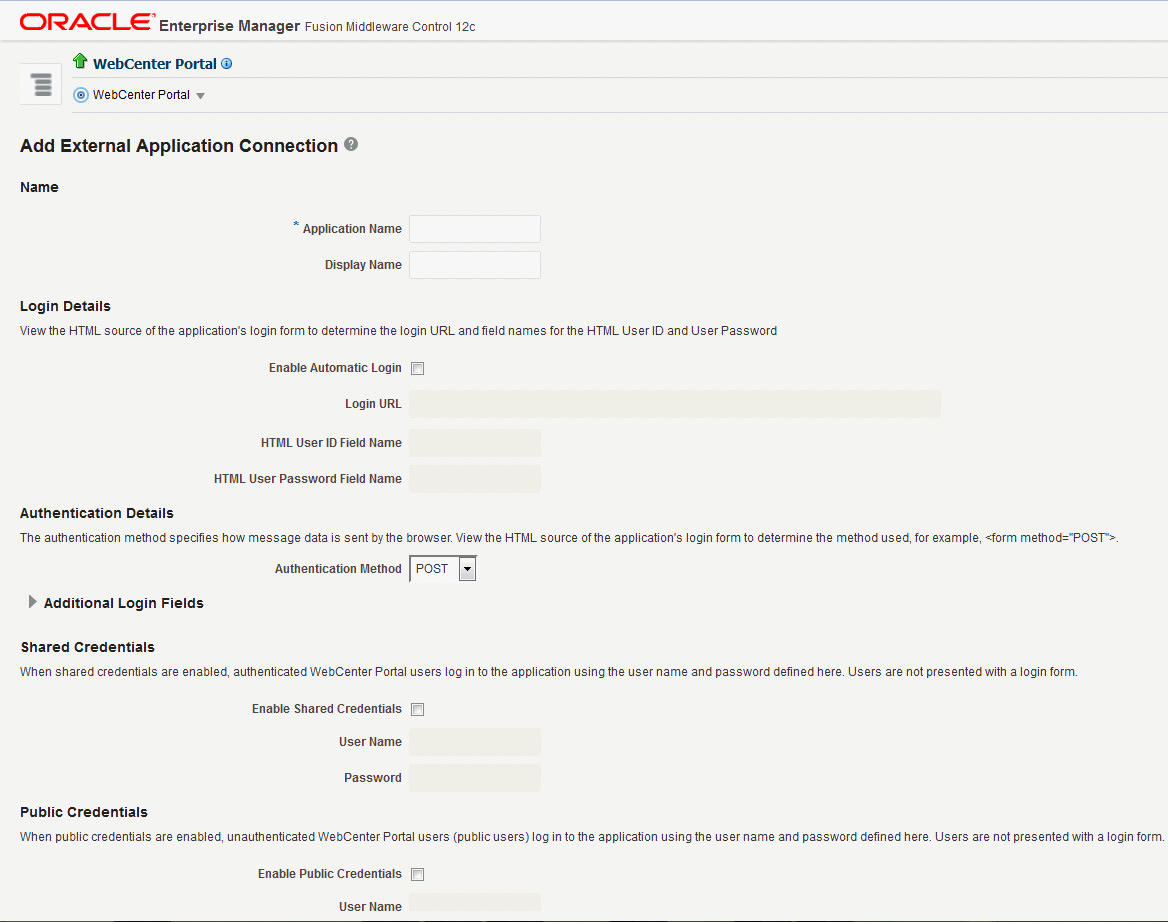 WLSTコマンドのaddExtAppCredentialを使用して、外部アプリケーション接続の共有資格証明またはパブリック資格証明を追加します。詳細は、『WebCenter WLSTコマンド・リファレンス』のaddExtAppCredentialを参照してください。