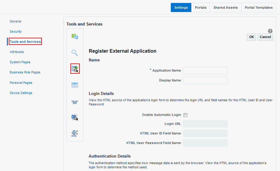 WebCenter Portal管理を使用した外部アプリケーションの登録の詳細は、実行時の外部アプリケーションの登録を参照してください。