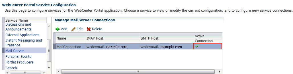 複数のメール・サーバー接続に登録できます。新しいメール接続の使用を開始するには、WebCenter Portalがデプロイされている管理対象サーバーを再起動する必要があります。