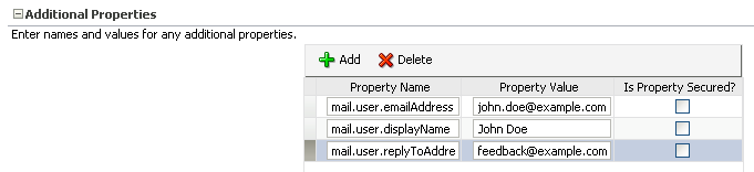 これらのプロパティは、特定のメール・アドレスが外部アプリケーションとメール・サーバーで同じであることを保証します。これらのプロパティはメール接続に追加され、メールで「送信元」、「表示名」および「返信先」の各フィールドに使用されます。