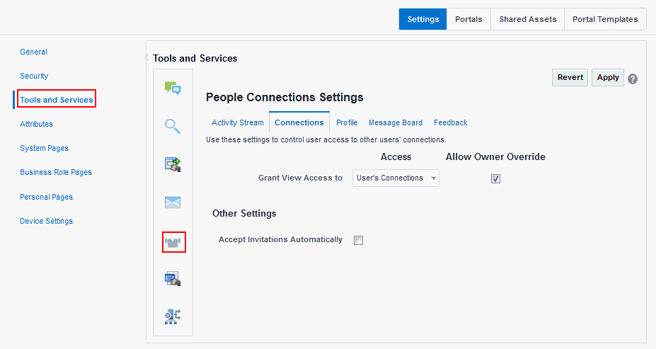 コネクションの構成では、別のユーザーのコネクションを表示できるユーザーを選択した後、それらのユーザーがコネクションへの参加の招待を自動的に承諾するかどうかを指定します。