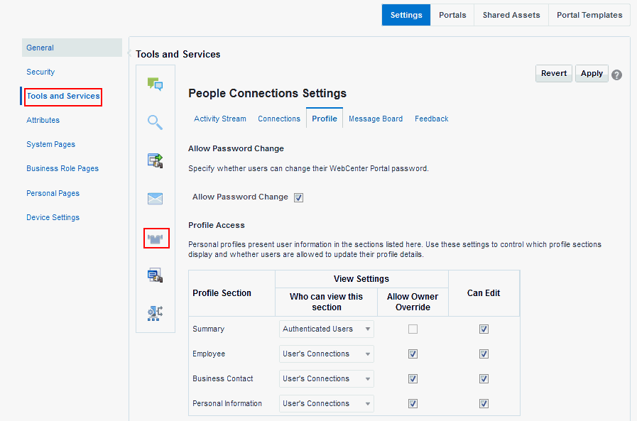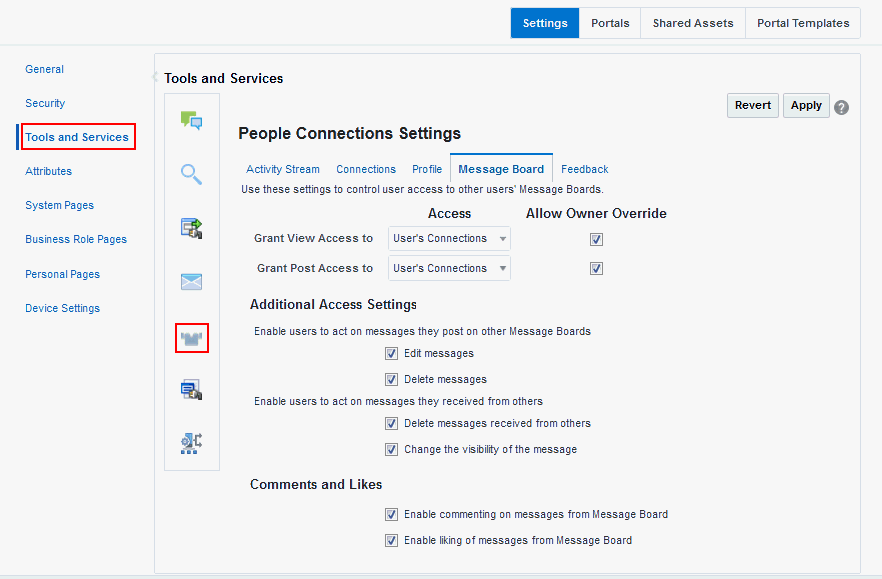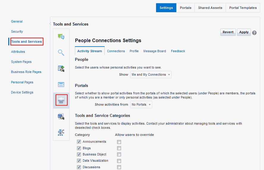 「設定」ページで(「WebCenter Portal管理の設定ページへのアクセス」を参照)、「ツールとサービス」をクリックします。