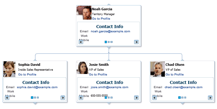 組織ビュー・タスク・フローと「プロファイル」ページの「組織」タブでは、管理チェーンのビジュアライゼーションが提供されます。たとえば、上司と直属の部下についてのビューがレンダリングされます。