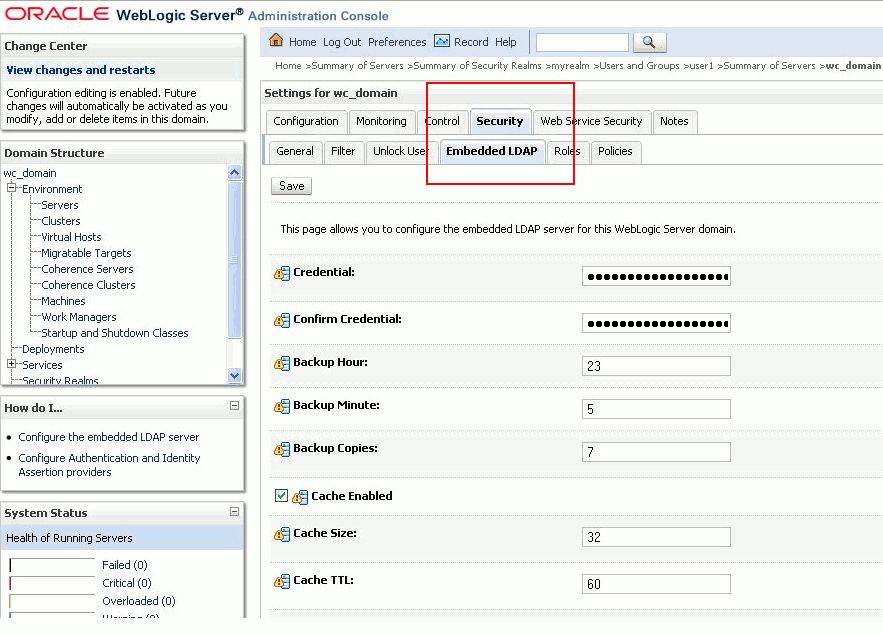 wc_domain)をクリックして「セキュリティ」タブを開き、「組込みLDAP」サブタブを開きます(図10-7)。図10-7 Oracle WebLogic Server管理コンソール