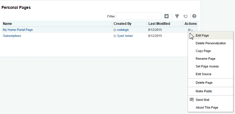 システム管理者は、すべての人の個人用ページに、WebCenter Portal管理の「個人用ページ」ページからアクセスできます。「アクション」メニューはリストされたそれぞれのページに関連付けられており、ページ・エディタでの編集、ユーザー・カスタマイズの削除、コピー、名前変更、保護、ソースの編集、削除および個人用ページのパブリック化のためのオプションへのアクセスを提供します(図38-1)。