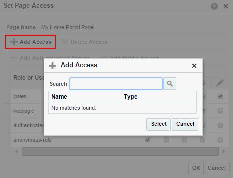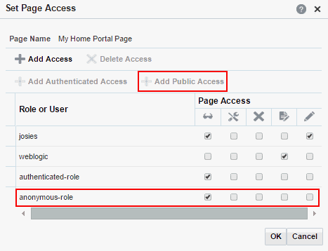 すべてのパブリック・ユーザー(WebCenter Portalにログインしなかったユーザーおよびログインしていたユーザー)にページ・アクセス権限を付与するには、「パブリック・アクセス権限の追加」をクリックします。