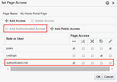 ページ・アクセス権限をすべての認証済ユーザー(つまり、WebCenter Portalにログインしているユーザー)に付与するには、「認証済アクセス権限の追加」をクリックします。