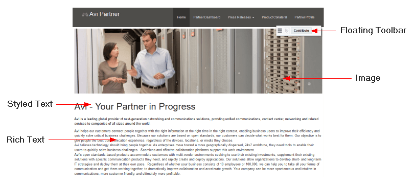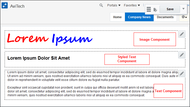 WebCenter Portalは、自分のポータルのページに、イメージ、書式設定済テキスト、埋込みビデオなどの単純なコンテンツを素早く簡単にコントリビュートおよび公開する方法を提供します。