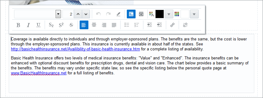 ページにテキスト・コンポーネントが含まれる場合は、より長いテキスト(ニュース記事の本文、プレス・リリース、レビュー、イベントの説明、手順のリストなど)をページに配置できます。独自の書式を適用したり、ハイパーリンクをテキストに追加することができます。詳細は、「リッチ・テキストのコントリビュートと公開」を参照してください。