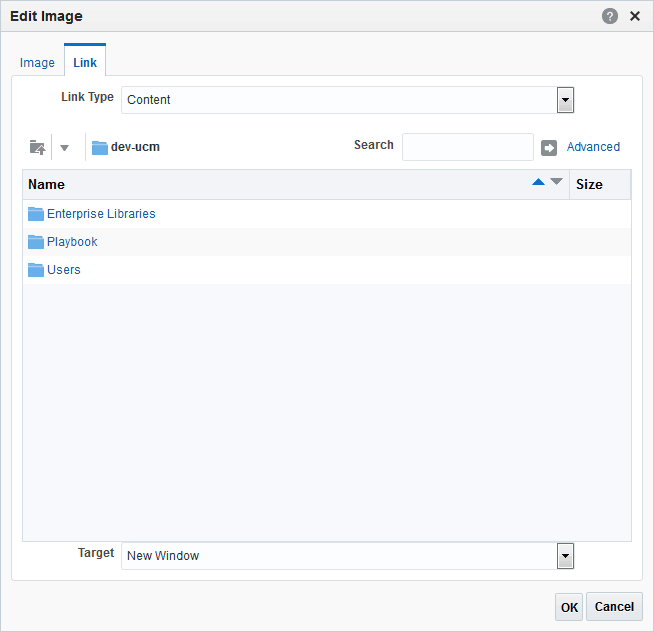 「コンテンツ」: リンク宛先をOracle WebCenter Content Serverリポジトリからのアイテムとして指定します。