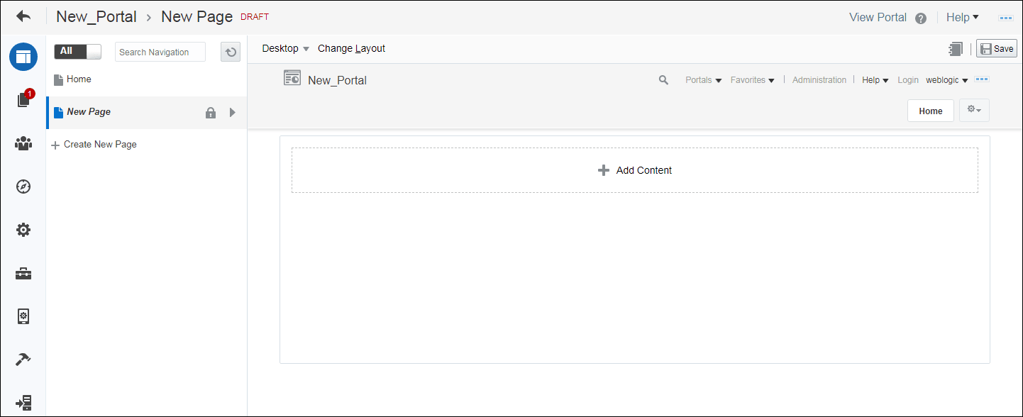 - ポータルで、新しいページを作成します。ポータルとページのアクション・ドロップダウン・メニューから「ページの作成」オプションを選択します。