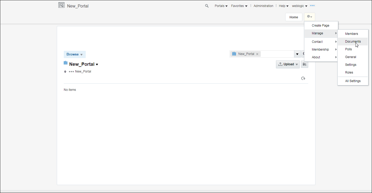 次の図に示すように、「ポータルの表示」リンクをクリックし、ドロップダウン・メニューから「管理」→「ドキュメント」オプションを選択してコンテンツ・マネージャを表示します。詳細は、「コンテンツ・マネージャ・インタフェースの理解」を参照してください。