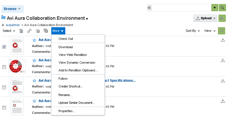 「ドキュメント・プロパティ」ページを表示するリンク、および最近リリースされたリビジョンまたはオプションで特定のリビジョンのネイティブ・ファイルへのリンクを結果リストに表示します。このアクションは、複数のアイテムが選択されている場合は使用できません。 |