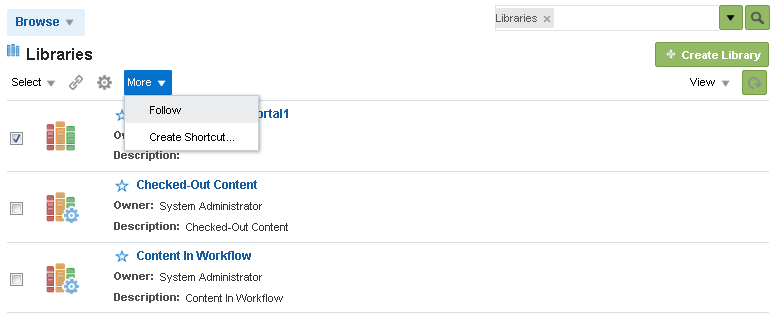 | ライブラリへのショートカットの作成 | 「その他」メニューの「ショートカットの作成」アクション | ナビゲートを容易にするために、ライブラリへのショートカットを作成します。詳細は、「ライブラリ・ショートカットの作成」を参照してください。 |