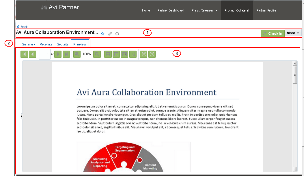 「ドキュメントの表示」ページは、結果リストからドキュメントを開くと表示されます。このページを使用して、ドキュメントのコンテンツおよびメタデータ・プロパティを表示でき、ドキュメントのバージョンの更新、メタデータの編集またはドキュメントのダウンロードなどのタスクを実行できます。「管理」→「ツールとサービス」→「ドキュメント設定」で選択したタブは(「ツールとサービスの管理の概要」を参照)、ユーザーがコンテンツ・マネージャでファイルをクリックしたときのデフォルトのタブになります。たとえば、「ドキュメント設定」で「プレビュー」タブを選択した場合は、これがデフォルトのタブになります。コンテンツ・マネージャでドキュメントを開くと、「プレビュー」タブにドキュメントが表示されます。
