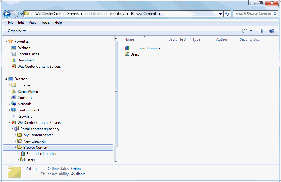 コンピュータにDesktopクライアントをインストールすると、MicrosoftエクスプローラーにWebCenter Content Serversという最上位ノードが表示されます。これを使用してポータル・リポジトリに接続し、そこに格納されているドキュメントを操作できます。