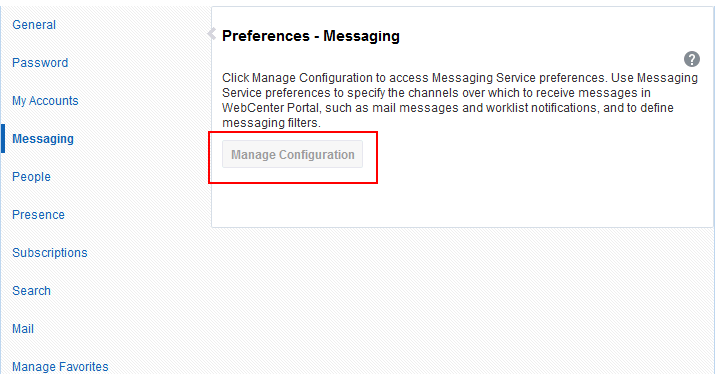 ノート: 「構成の管理」ボタンは、WebCenter PortalでBPELサーバーが構成されている場合にのみアクティブになります。BPELサーバーがない場合、このボタンはグレー表示になり、デフォルトのメッセージング・チャネルであるメールが通知に使用されます。BPELサーバーには通知機能が用意されているため、システム管理者がBPELサーバーのかわりにメール・サーバーを通知に使用することを選択していても、「構成の管理」ボタンはアクティブである場合があります。複数のBPEL接続が登録されている環境では、すべての接続がメッセージング・プリファレンス・リポジトリを共有します。1つのBPEL接続に対して設定したメッセージング・プリファレンスが、すべての接続に適用されます。