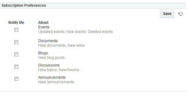権限: この章で説明するタスクは、すべてのWebCenter Portalユーザーが使用できます。ただし、システム管理者は、特定のアプリケーションのデフォルト設定を強制適用していることがあります。そのため、サブスクリプションと通知のプリファレンスを設定できないことがあります。アプリケーションのデフォルト設定が強制適用される場合、この章で説明する一部のアクションは実行できません。