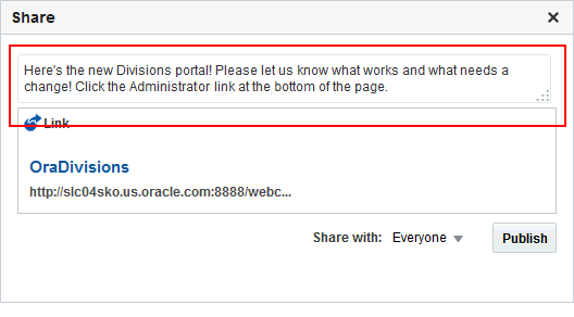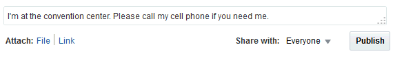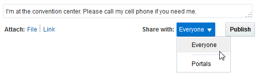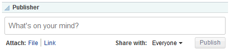 パブリッシャは、パブリッシャを使用してユーザーが入力したメッセージが表示されるアクティビティ・ストリームと連携して動作します。パブリッシャ・コントロールを使用して、公開したメッセージを参照できるユーザーを選択できます。