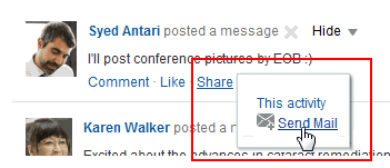 アクティビティ・ストリームで受信したアイテムを、電子メールで送信して共有する(詳細は、「ストリームされたアイテムの電子メールでの送信」を参照)。