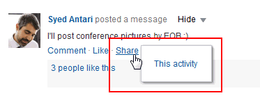 アクティビティ・ストリームで受信したアイテムを、コネクションのアクティビティ・ストリームに投稿することにより、共有する(詳細は、「ストリームされたアイテムの再投稿」を参照)。