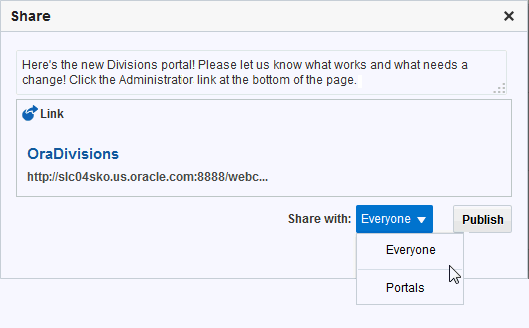 ノート: パブリッシャの「共有対象」メニューはホーム・ポータルのみに表示され、他のポータルには表示されません。このメニューにより、ユーザーは、情報をあなたのコネクションと共有するか、または指定したポータルのメンバーとのみ共有するかどうかを選択できます。パブリッシャがホーム・ポータル以外のポータルにある場合、公開される情報は常にそのポータルのメンバーと共有されます。