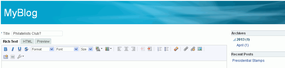 ブログ投稿に対する変更内容を保存するたびに、WebCenter Portalはそのファイルを自動的にチェックインして、そのブログ投稿の新規バージョンを作成します。つまり、ブログ投稿の最後に保存されたバージョンが現在のバージョンとして表示されます。