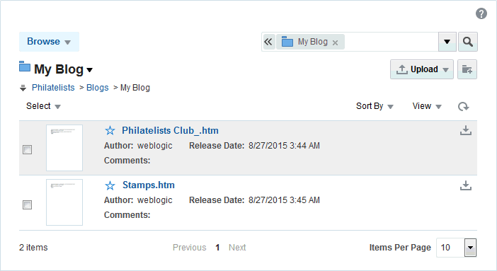 図17-3では、MyBlogの例のディレクトリ構造を示しており、ここには2つのブログ投稿が含まれています。上部のブレッドクラムは、これらのブログ投稿がポータル内のMyBlogフォルダ内で作成されたことを示しています。