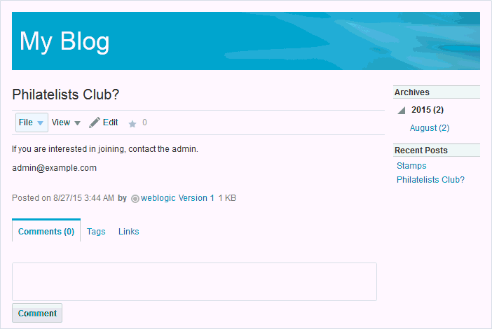認証済ユーザーは「投稿の編集」(鉛筆)アイコンをクリックして投稿を編集できます。また、投稿の下にある対応するタブでコメント、タグおよびリンクを追加することもできます。表示のみの権限を持つ認証済(WebCenter Portalにログイン中)ユーザーは、ブログ投稿の下にある「コメント」リンクをクリックしてその投稿にコメントを追加できます。パブリック・ユーザーは、ブログ投稿にコメントすることはできません。