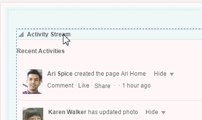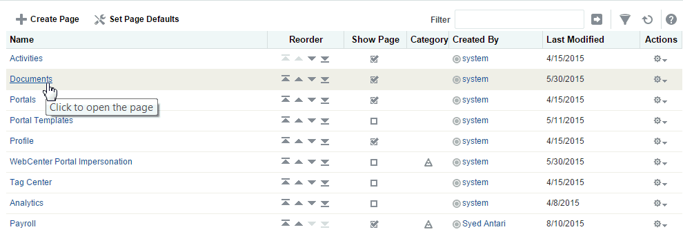 ページの自身のビューは様々な方法で変更できます。たとえば、ページ・コンテンツのビューを並べ替えたり、コンポーネントを非表示にしたり、サイズを変更することができます(「ホーム・ポータルでのページのビューのカスタマイズ」を参照)。