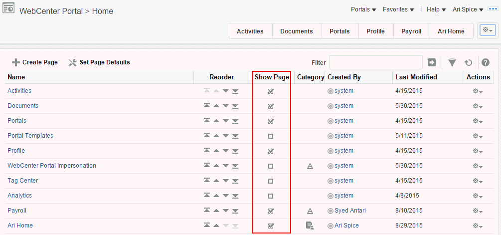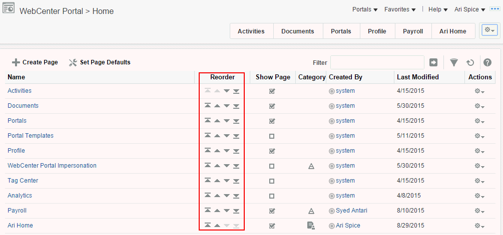「ページのパーソナライズ」ページでは、ホーム・ポータルでページが一覧表示または配置される順序を変更できます。この設定は、ホーム・ポータルで公開されるタブの順序に影響します。