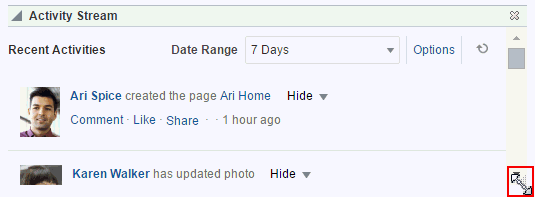 コンポーネントの周囲の枠線およびヘッダーは、クロムとも呼ばれます。クロムは、コンポーネントの境界線を明確にして、コンポーネントに対するアクションのアクセス・ポイントとなります。これらのアクションとしては、「アクション」メニューに含まれているものや、そのクロム自体に埋め込まれているものがあります。後者の場合は、クロムには、コンポーネントの高さを調整するためのサイズ変更ハンドルが付随していることがあります(図6-4)。
