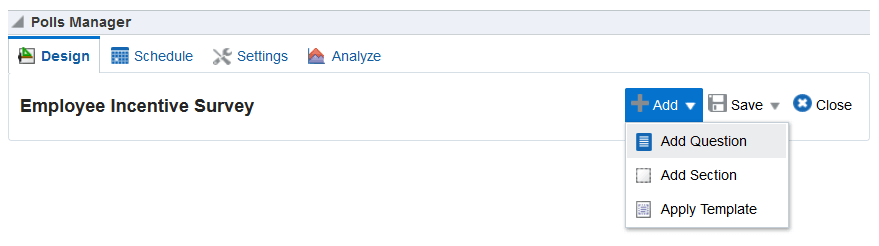 「デザイン」ページで、「追加」をクリックして、投票に既存のテンプレートを移入するか、または質問や周囲のテキストを移入するかを選択します。