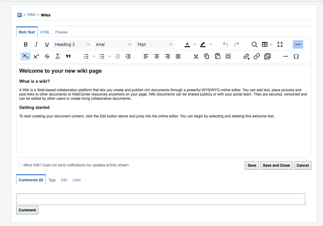 WebCenter Portalでは、Wikiページ・スタイルを使用してWikiページを作成します。Wikiページ・スタイルでは、リッチ・テキスト・エディタ(RTE)を使用してその場で編集可能な機能を提供するデフォルトのWikiドキュメントが表示される専用のWikiページをサポートします。