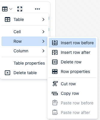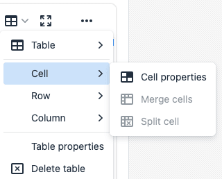 リッチ・テキスト・エディタで、セルの挿入や削除、結合、またはセルのプロパティの変更を実行できます。