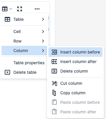 図16-18 リッチ・テキスト・エディタ: 表の「列」のアクション