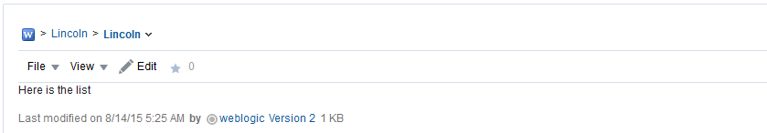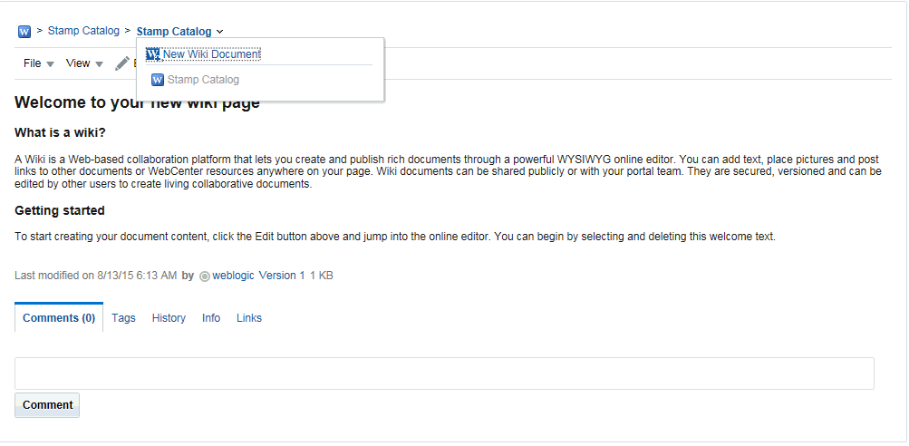 Wikiドキュメントへの変更を保存するたびに、WebCenter Portalはそのファイルを自動的にチェックインして、そのWikiドキュメントの新規バージョンを作成します。つまり、最後に保存されたWikiドキュメントのバージョンが現在のバージョンとして表示されます。
