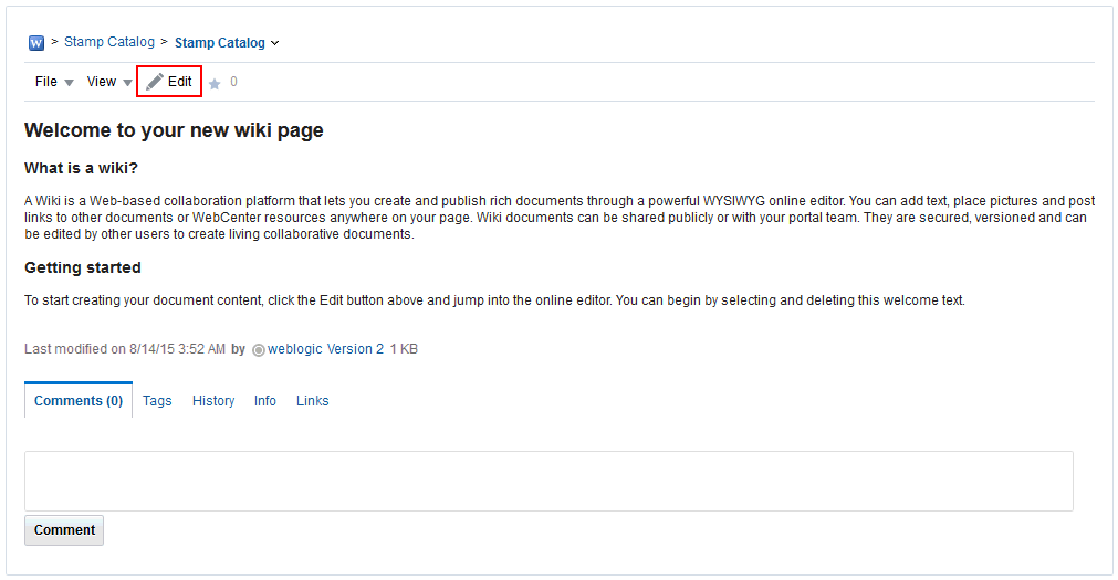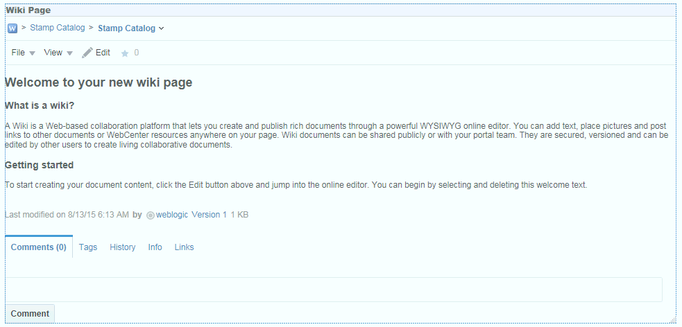 最初のWikiページには、図16-1のようなデフォルトのテキストによるデフォルトのWikiドキュメントが含まれます。