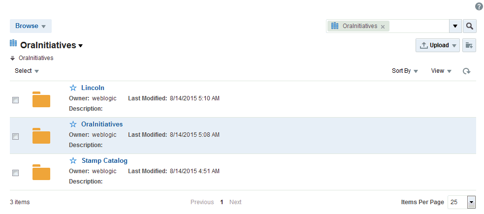 「コンテンツ・マネージャ」タスク・フローで、ルート・フォルダのWikiページ用の個別フォルダに格納されている新規作成されたWikiドキュメントを確認できます(図16-2)。フォルダとデフォルトのWikiドキュメントの両方が同じ名前を共有します。