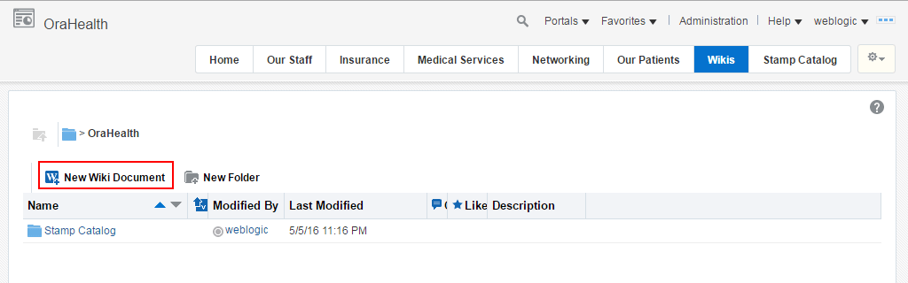 「コンテンツ・マネージャ」タスク・フローで、既存のWikiドキュメントと同じ名前で、ポータルのルート・レベルにフォルダを作成します(「フォルダおよびファイルの使用」を参照)。たとえば、既存のWikiドキュメントの名前が