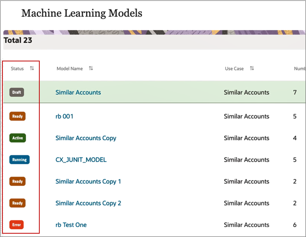 「機械学習モデル」リストのスクリーンショットを次に示します。 「ドラフト」、「準備完了」、「実行中」、「エラー」など、様々なステータスの類似した7つのアカウント・モデルが表示されています。 「ドラフト」および「準備完了」ステータスの多数のモデルが存在できますが、アクティブにできるモデルはその中の1つのみです。 また、モデル・ステータスは様々な色で示されます。 たとえば、「エラー」ステータスは赤色のボックスで表示され、「実行中」ステータスは青色で表示され、「アクティブ」は緑色で表示されます。