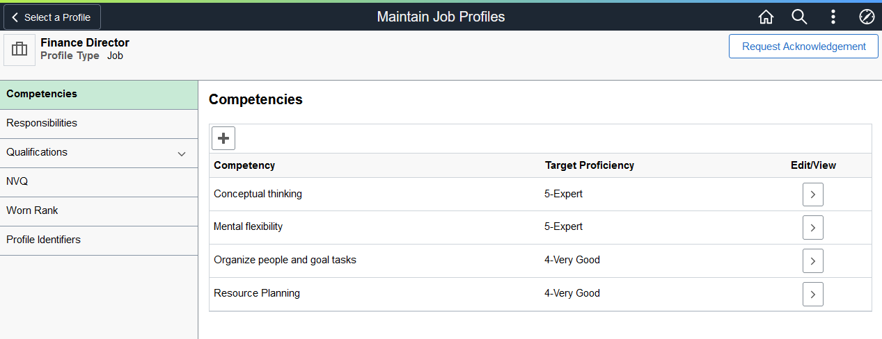 (Managers) The Request Acknowledgement button appears for managers on the Maintain Job Profiles page when the profile type and identifier has been configured to participate in the acknowledgement process on the Profile Types - Identities Page.