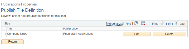 Use the Publication Properties: Publish as Tile page (EPPCM_CATG_GPLT) to review, edit or delete a Publication tile. Use the Section Properties: Publish as Tile Page to review, edit or delete a Section tile.