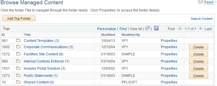 Use the Browse Managed Content page (EPPCM_HIERTOP_MAIN) to add a top-level folder if you are a top administrator for this feature or, starting at the top level folders, drill down through folder hierarchies for content that is accessible by that feature.