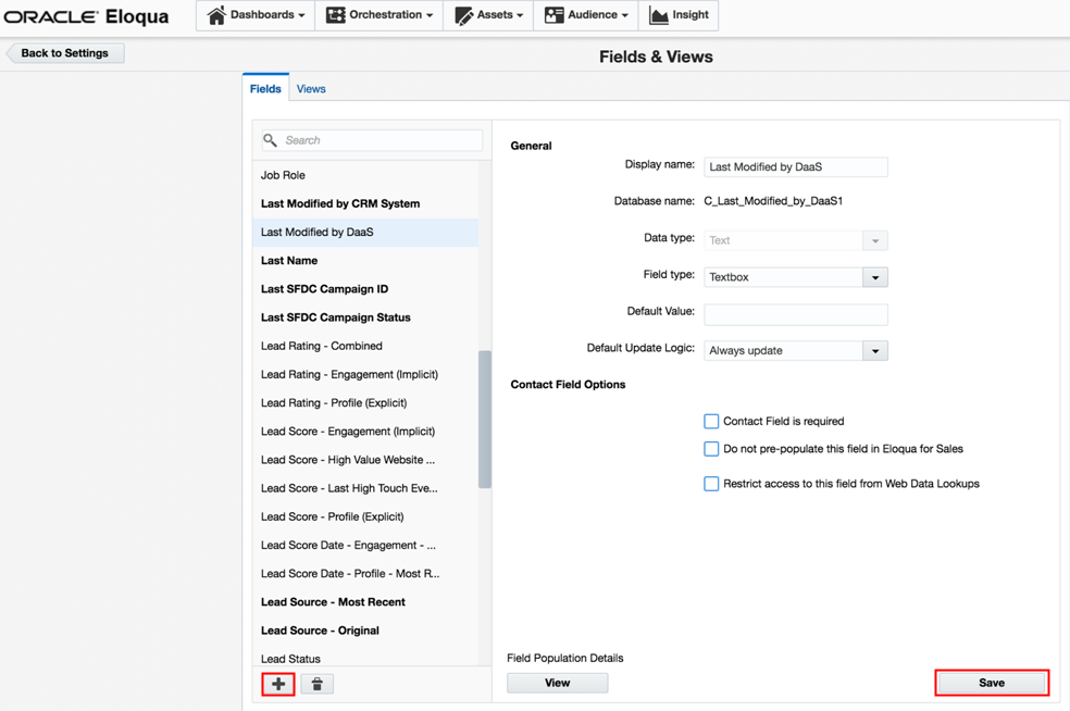 Eloqua管理者は、ユーザーがDaaSからデータを追加またはエンリッチする前に、特定のフィールドおよびビューを作成する必要があります。 「前提条件: Eloquaでのフィールドおよびビューの作成」のステップに従います。