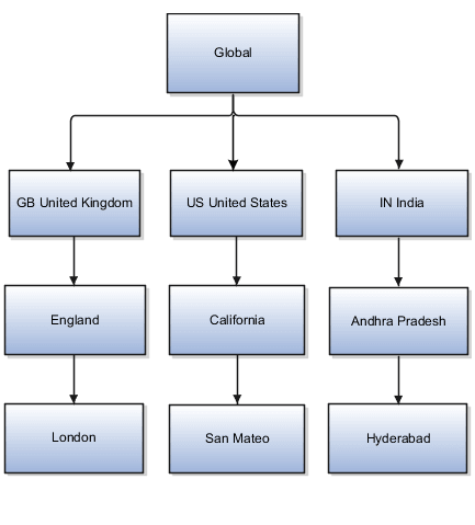 事前定義された地理ツリー構造のバージョンを作成して、企業が経営されている国を表すことができます。 国ごとに、州や市などの下位レベル・ノードを定義できます。 たとえば、イギリス - イングランド - ロンドンなどです。 ツリーは、「ワークフォース・ストラクチャ」作業領域で管理します。