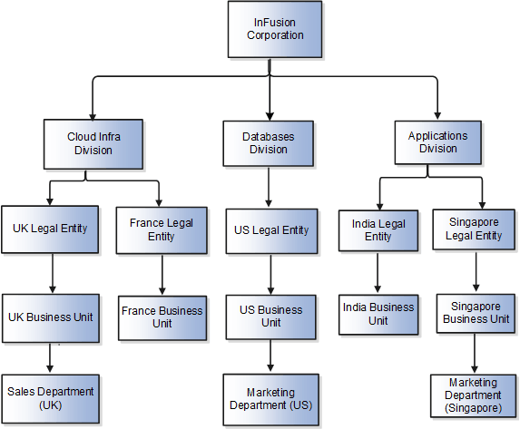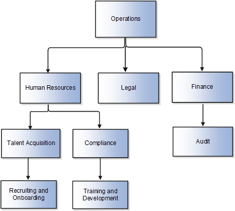 たとえば、部門ツリーの図では、Operationsはその子ノードであるHuman Resources、LegalおよびFinanceの親です。